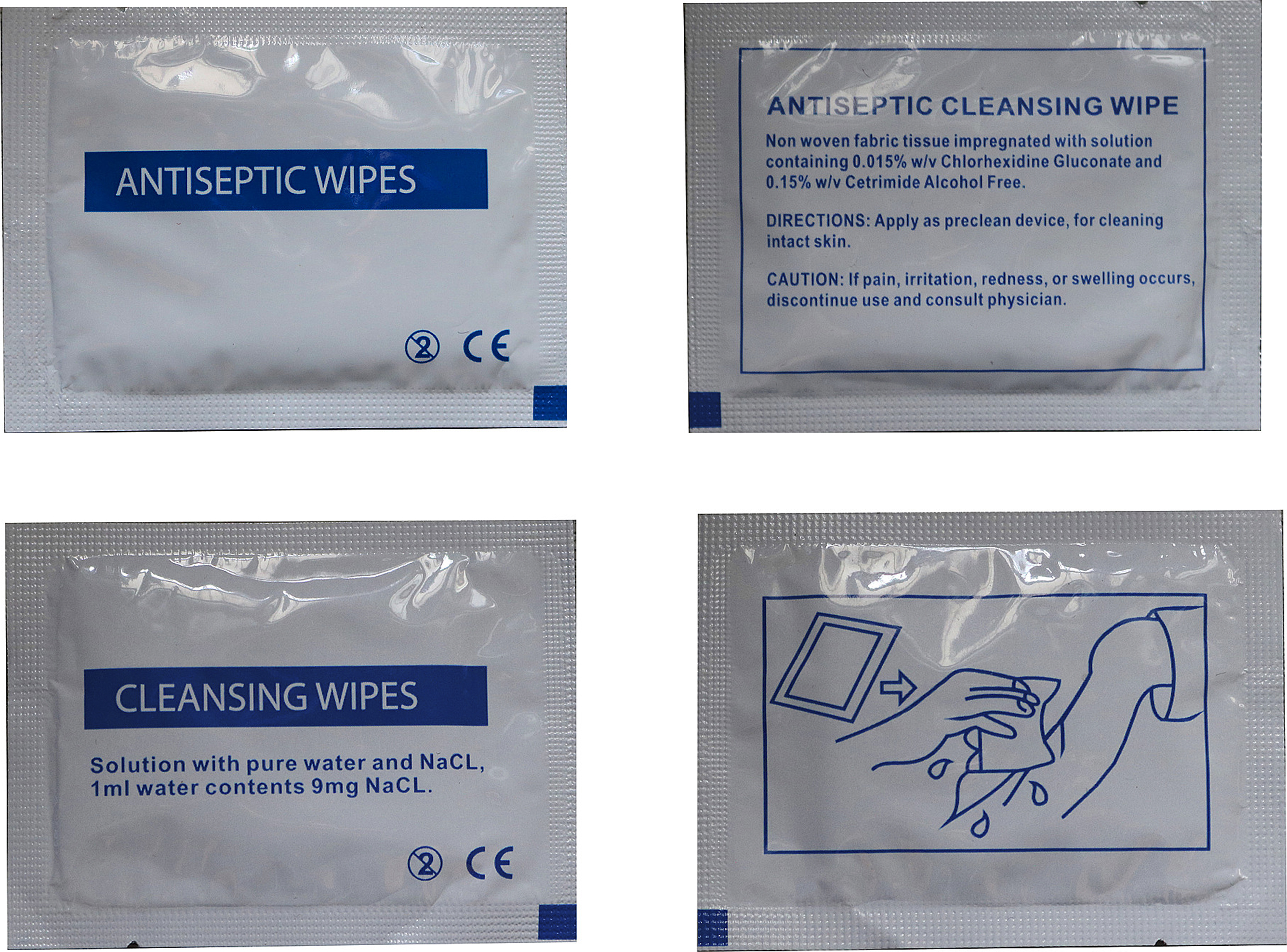 Non-woven fabric. The product is saturated with medical physiological saline, 70% isopropyl alcohol, soap, or other medical solutions. It is used for hand cleaning, wound cleaning, and wound infection prevention. Packed in aluminum foil, it keeps the humidity. It is sterilized by gamma radiation.